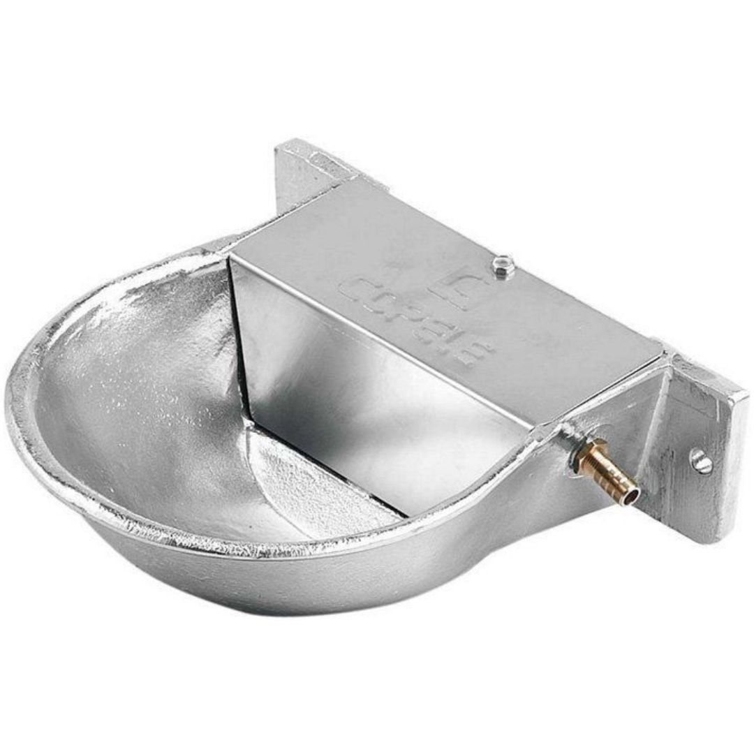 Bebedero de nivel constante para perros Fabricado en aluminio resistente a la corrosión del agua Solapas con agujeros para su fijación o instalación en la pared o en laterales del box de perros Válvula a baja presión con conexión de goma flexible de 10 mm Recubierto o bañado en una película trasparente e incolora, para evitar filtraciones de agua por la porosidad del aluminio.